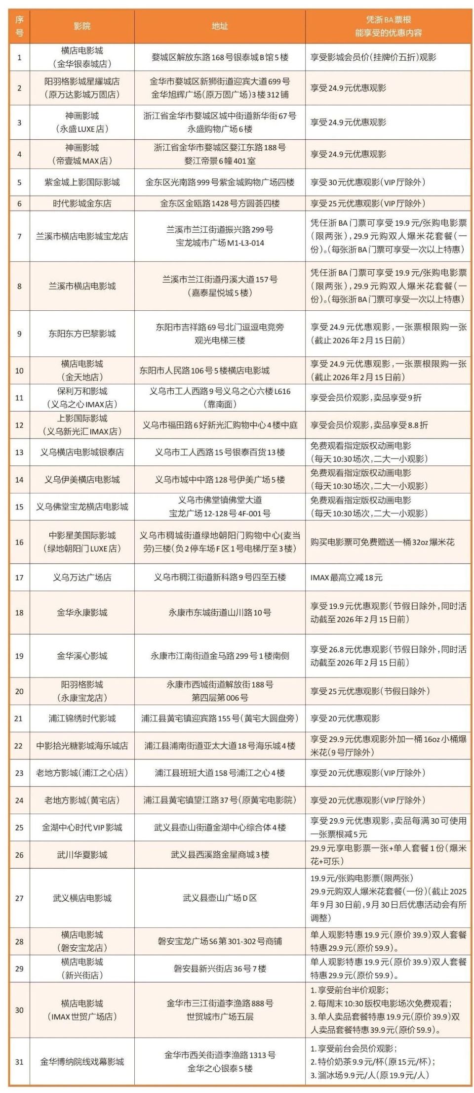 01活动时间第二期(金华)“浙BA”票根观影优惠名单已经出炉。9月1日—2026年2月28日,凭“浙BA”观赛票根(大麦电子票根),至金华全市31家影院可享受观影优惠。